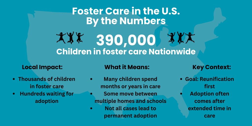 Across the United States, hundreds of thousands of children move through the foster care system each year, often facing uncertainty about where they will live, who will care for them, and what their future will look like. According to data from the U.S. Department of Health and Human Services, more than 390,000 children are currently in foster care nationwide.